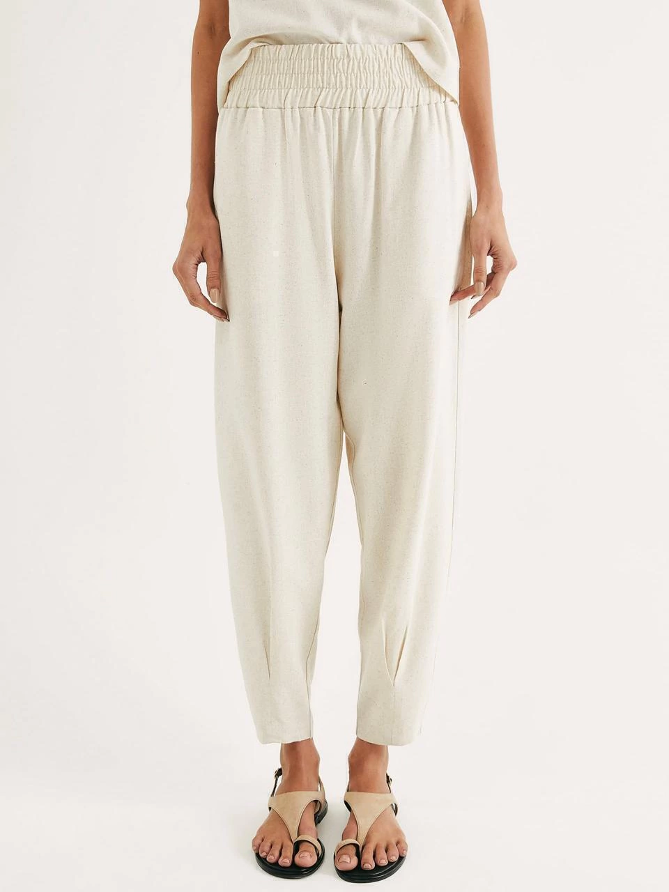Calça feminina slouchy cintura alta com linho, opção perfeita para criar looks casuais com estilo. Elaborada em tecido de viscose com linho, possui modelagem slouchy, cintura alta e cós largo com elástico embutido, tornando a peça ajustável a vários biotipos de corpos.