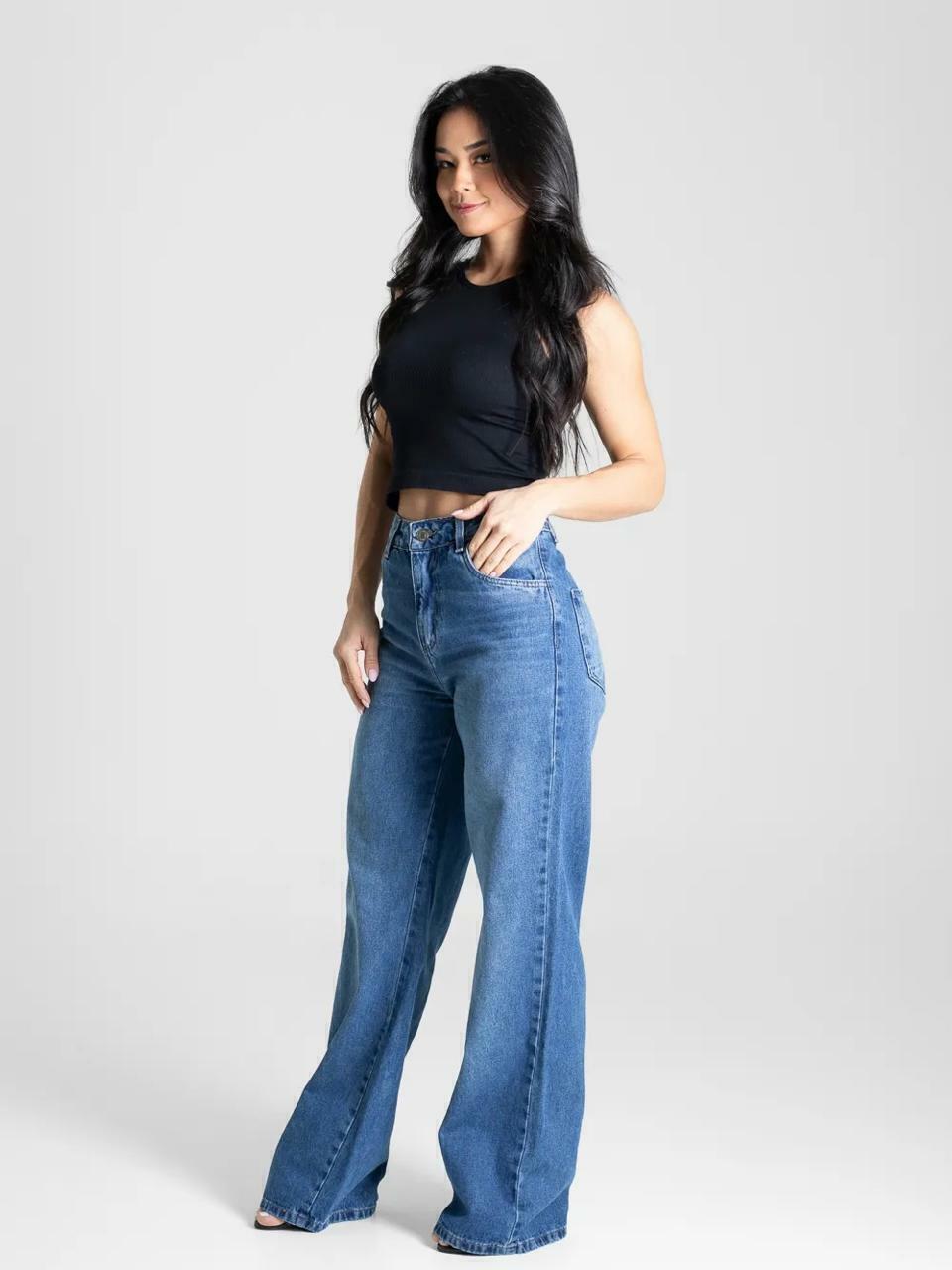 Calça feminina confeccionada em jeans. O modelo possui cintura super alta, gancho no lugar e caimento amplo da coxa até a barra. Cintura alta Fechamento através de um botão e zíper Bolsos frontais e posteriores funcionais Barra simples Tecido: Jeans Tipo de Lavagem: Azul Cor: Azul