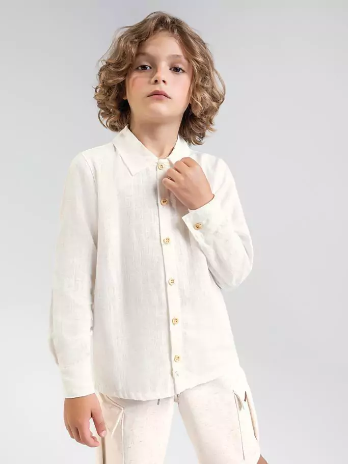 Camisa manga longa em viscolinho com botoes estilo madeira.