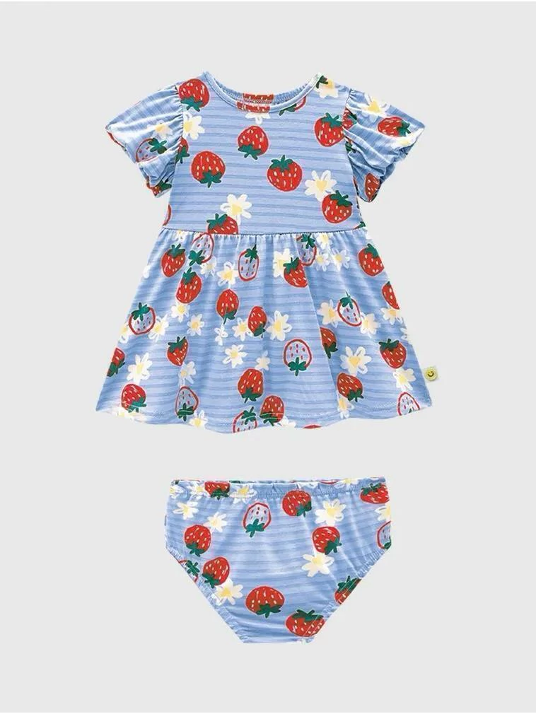 O Conjunto Bebê Menina Vestido + Calcinha Estampa Morangos é feito em meia malha 100% algodão, garantindo conforto e frescor para a pele delicada das bebês. Com estampa alegre e cores vibrantes, é perfeito para os dias quentes, unindo estilo e praticidade para as crianças brincarem com liberdade.