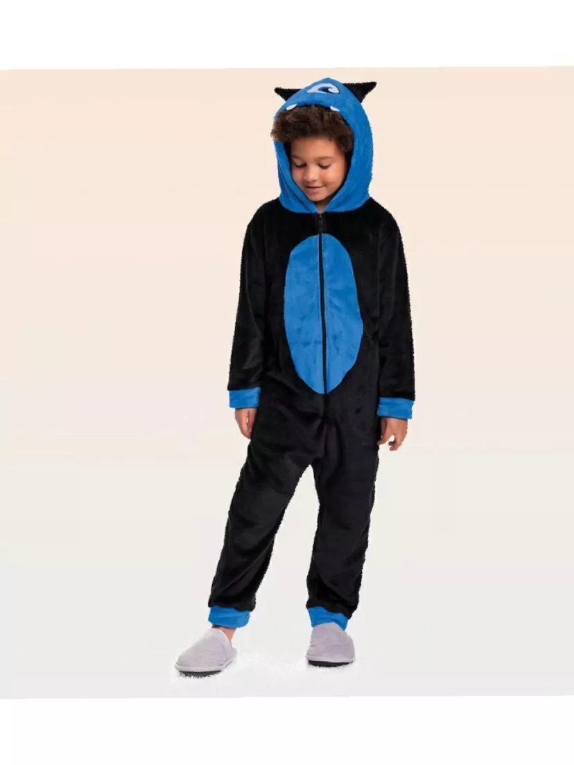Kigurumi de monstro super fofo e colorido para noites de festa do pijama. O modelo possui decote redondo, mangas longas, capuz bordado com aplique em meia malha, aplique interativo em feltro, orelhas interativas, fechamento em zíper, recorte, aplique interativo e modelagem ampla.