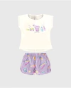 blusa gola redonda com estampa, shorts com elastico no cós, tambem estampado
